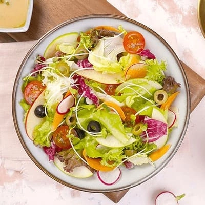 Xà lách carol, xà lách frise, xà lách lô lô tím, xà lách mỡ, xà lách radicchio tím, táo đỏ, táo xanh, cà chua bi, củ cải đường, rau mầm, cà rốt baby, trái olive đen, trái olive xanh.